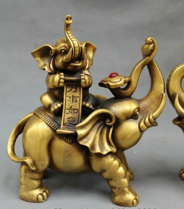 S4047 9" Chinese Bronze Animals RuYi Wealth YuanBao Fu Elephant Family Statue Pair D0318