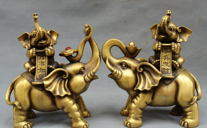 Review S4047 9" Chinese Bronze Animals RuYi Wealth YuanBao Fu Elephant Family Statue Pair D0318