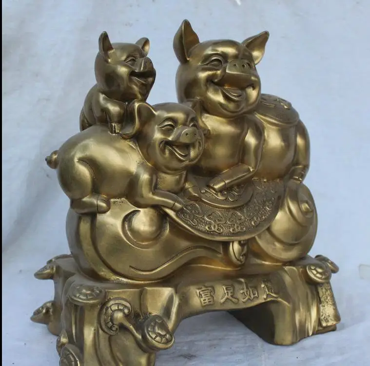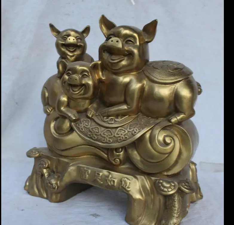 671115398++++14" China Folk Feng Shui Brass Farm Livestock Pig Family Ru Yi Statue Sculpture