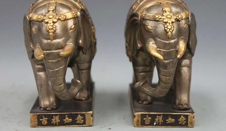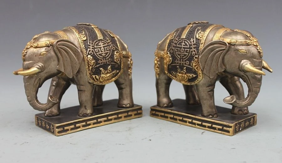 100% Bronze 24K Gold Silver Auspicious Elephant Imperial family statue pair
